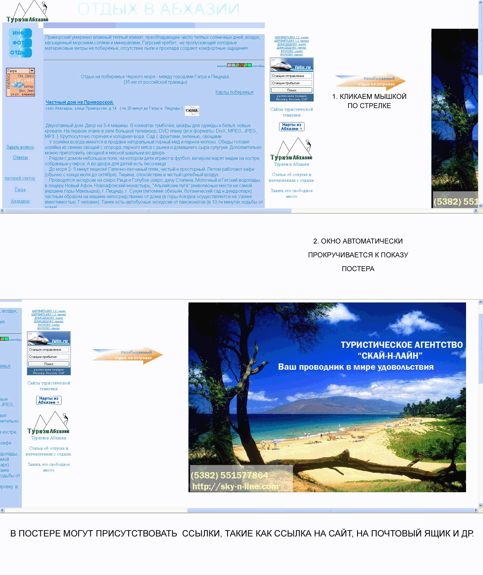 РЕКЛАМА НА САЙТЕ По вопросам размещения рекламы на данном сайте связывайтесь по адресу Новый большой формат: бэкграунд постер. Посмотреть пример. Размер, форма и положение постера с указателем на него (если нужен) согласовываются. Также возможен вариант газетной колонки (артикл). Посмотреть пример. Цены при размещении на 3 месяца: текстовая ссылка на главной странице - 50р. баннер на главной странице - 100р. баннер на главной странице (срок размещения июнь - сентябрь) - 150р. постер - 350р. артикл - 350р. Возможны и другие сроки размещения и варианты. Всё обсуждается и согласуется с вами. Места размещения ссылки, баннера, постера на главной странице можно согласовать. Артикл прокручивается обычной полосой прокрутки в браузере, при этом возникает эффект листания страниц с описанием компании. С примером можно ознакомиться по запросу на email.